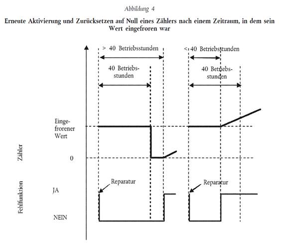 11.4.2.1.4. Sobald er eingefroren ist, ist der Zähler auf Null zurückzusetzen, wenn die für diesen Zähler relevanten Überwachungsfunktionen mindestens einmal ihren Überwachungszyklus durchlaufen haben, ohne dass sie eine Fehlfunktion erkannt haben, und keine für diesen Zähler relevante Fehlfunktion in den 40 Motorbetriebsstunden seit letztmaligem Anhalten des Zählers (siehe Abbildung 4) erkannt wurde.