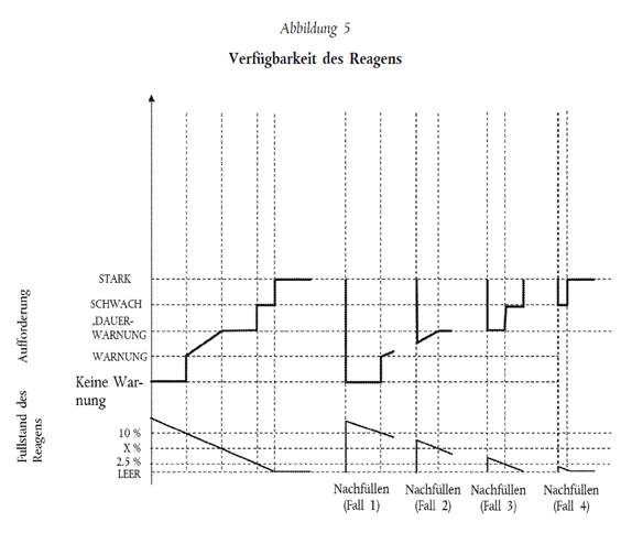 — Nachfüllen, Fälle 2 und 3 (‚unzulängliches‘ Nachfüllen): Das Warnsystem ist aktiviert. Die Stufe der Warnung hängt von der verfügbaren Reagensmenge ab.