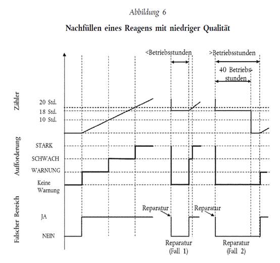 — Reparaturfall 1 (‚schlechte‘ oder ‚unlautere‘ Reparatur): Nach der Deaktivierung der Maschine wechselt das Bedienpersonal das Reagens gegen ein Reagens mit höherer Reagensqualität aus, tauscht dieses Reagens aber nach kurzer Zeit wieder gegen ein Reagens mit niedrigerer Qualität aus. Das Aufforderungssystem aktiviert sich sofort erneut und der Maschinenbetrieb wird nach zwei Motorbetriebsstunden deaktiviert.