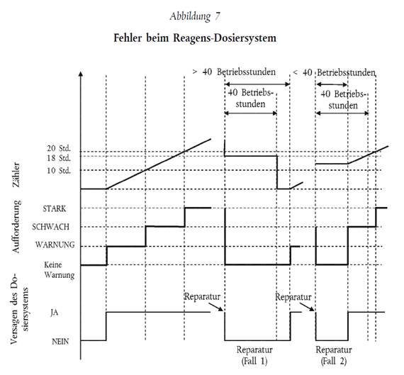 11.5.4. Abbildung 7 veranschaulicht drei Fälle von Fehlern beim Harnstoff-Dosiersystem. Diese Abbildung veranschaulicht auch den Prozess, der im Fall von den in Abschnitt 9 dieses Anhangs beschriebenen Überwachungsfehlern Anwendung findet.