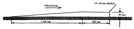 1. a) mit geringer Geschwindigkeit (5 1 km/h) über eine Schwelle von 80 mm Höhe mit dem in Abbildung 1 gezeigten Profil gefahren werden; auf Frequenz und Dämpfung ist die kurzzeitige Schwingung zu untersuchen, die sich ergibt, nachdem die Räder an der Antriebsachse die Schwelle wieder verlassen haben; oder