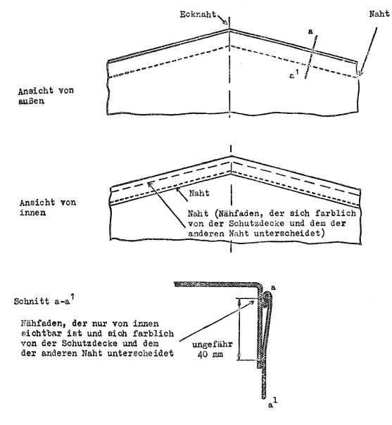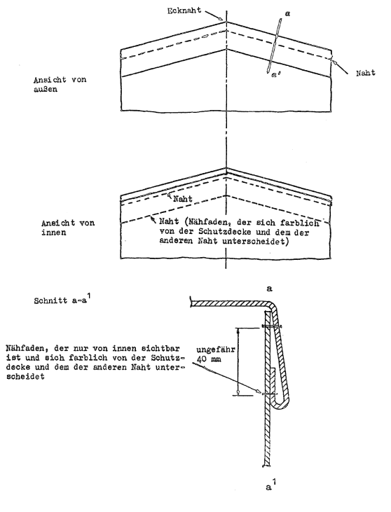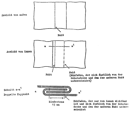 (3) Ist die Schutzdecke aus mehreren Stücken zusammengesetzt, so müssen die Ränder der Stücke ineinandergefaltet und durch zwei mindestens 15 mm voneinander entfernte Nähte miteinander verbunden sein. Die Nähte müssen entsprechend der diesen Vorschriften beigefügten Zeichnung 1 ausgeführt sein; wenn es jedoch bei gewissen Teilen der Schutzdecke (wie z. B. bei Überfällen und verstärkten Ecken) nicht möglich ist, die Stücke auf diese Weise zusammenzunähen, so genügt es, daß nur der Rand des oberen Teiles umgefaltet und entsprechend der diesen Vorschriften beigefügten Zeichnung 2 oder 2a angenäht ist. Die eine Naht, deren Faden sich in der Farbe vom Faden der anderen Naht und von der Schutzdecke deutlich unterscheiden muß, darf nur an der Innenseite sichtbar sein. Alle Nähte müssen mit der Maschine genäht sein.