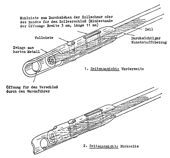 (10) Jedes Seil, gleich welcher Art, muss aus einem einzigen Stück bestehen und an beiden Enden mit einer Zwinge aus hartem Metall versehen sein. An jeder Zwinge muss die Zollschnur oder das Band für den Zollverschluss durchgezogen werden können. Die Befestigungsvorrichtung jeder Zwinge an den Enden von Seilen nach Absatz 9 Buchstaben a, b und d muss eine durch das Seil gehende Hohlniete enthalten, durch die die Zollschnur oder das Band für den Zollverschluss durchgezogen werden kann. Das Seil muss auf beiden Seiten der Hohlniete sichtbar sein, damit festgestellt werden kann, ob es aus einem einzigen Stück besteht (siehe die diesen Vorschriften beigefügte Zeichnung 5).