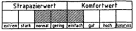 Die Kennzeichnung erfolgt in der Weise, daß ausgehend von der Mitte des Balkens bis hin zu dem jeweils ermittelten Strapazier- und Komfortwert alle Felder schraffiert werden.