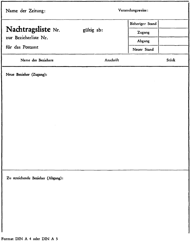 Muster einer Nachtragsliste zur Bezieherliste