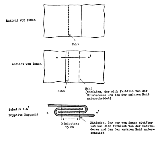 (3) Ist die Schutzdecke aus mehreren Stücken zusammengesetzt, so müssen die Ränder der Stücke ineinandergefaltet und durch zwei mindestens 15 mm voneinander entfernte Nähte miteinander verbunden sein. Die Nähte müssen entsprechend der diesen Vorschriften beigefügten Zeichnung 1 ausgeführt sein; wenn es jedoch bei gewissen Teilen der Schutzdecke nicht möglich ist, die Stücke auf diese Weise zusammenzunähen, so genügt es, daß nur der Rand des oberen Teiles umgefaltet und entsprechend der diesen Vorschriften beigefügten Zeichnung 2 angenäht ist. Die eine Naht, deren Faden sich in der Farbe vom Faden der anderen Naht und von der Schutzdecke deutlich unterscheiden muß, darf nur an der Innenseite sichtbar sein. Alle Nähte müssen mit der Maschine genäht sein.