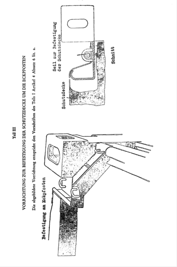 - Die diesem Teil III beigefügte Zeichnung gibt ein Beispiel für eine für zollamtliche Zwecke zugelassene Vorrichtung zur Befestigung der Schutzdecke um die Eckpfosten.