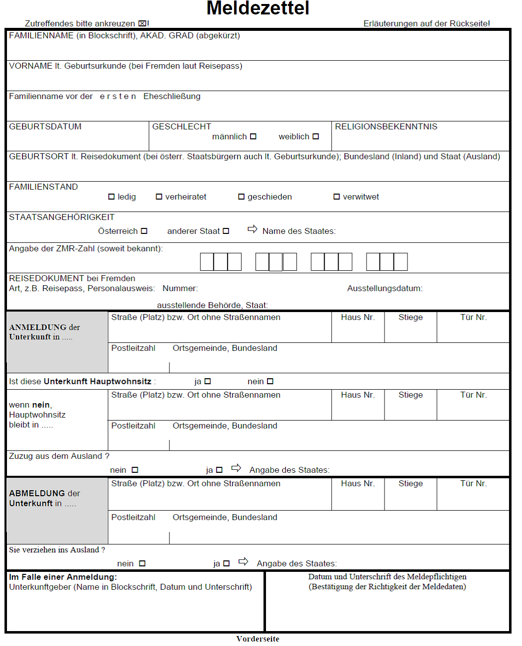 - 3. Für den Inhalt des Meldezettels ist, unabhängig davon, wer den Meldezettel ausfüllt, immer der Meldepflichtige verantwortlich. Kontrollieren Sie daher bitte den Meldezettel auf Vollständigkeit und Richtigkeit der Eintragungen, auch dann, wenn er von der Behörde ausgefertigt wird.