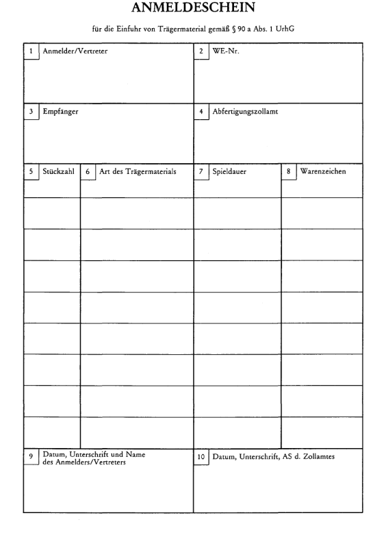 Gemäß § 90a Abs. 1 UrhG ist der vollständig ausgefüllte Vordruck vom Anmelder im Sinn der zollgesetzlichen Vorschriften bei der Abfertigung zum freien Verkehr oder zum Eingangsvormerkverkehr zum ungewissen Verkauf oder zur Einlagerung in ein offenes Lager auf Vormerkrechnung dem Zollamt vorzulegen. Inhaber von Bewilligungen zur Abgabe von Sammelanmeldungen nach § 52a Zollgesetz 1988, BGBl. Nr. 644, haben den vollständig ausgefüllten Vordruck gemeinsam mit der Sammelanmeldung dem Zollamt zu übergeben. Angaben in den Feldern 5 (Stückzahl), 6 (Art des Trägermaterials), 7 (Spieldauer) und 8 (Warenzeichen) können unterbleiben, wenn dem Vordruck Unterlagen (zB Rechnungen, Lieferscheine) haltbar angeschlossen werden, aus denen diese Angaben eindeutig zu ersehen sind.
