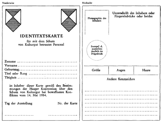 2. Diese Personen haben eine besondere mit dem Erkennungszeichen versehene Identitätskarte bei sich zu führen. Diese Karte muß mindestens den Familien- und Vornamen, das Geburtsdatum, den Titel oder Rang und die Funktion des Inhabers angeben. Die Karte muß ein Lichtbild des Inhabers und dessen Unterschrift oder Fingerabdrücke oder beides enthalten. Sie muß den Stempel der zuständigen Behörden in Prägedruck tragen.