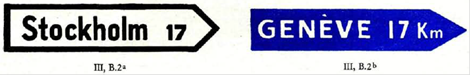 1. Die Wegweiser zur Angabe der Richtung, in der ein Ort liegt, haben die Form eines Rechtecks, dessen längere Seiten waagrecht liegen und das in einer Pfeilspitze endet.