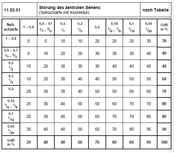 Für die Beurteilung des Sehvermögens ist die korrigierte Sehschärfe (Prüfung mit optischem Sehausgleich) maßgeblich. Daneben sind zusätzlich auch Ausfälle des Gesichts- und des Blickfeldes zu berücksichtigen.