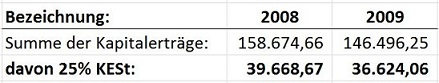 Die Kapitalerträge wie Gewinnanteile aus Wertpapierfonds und die daraus resultierende Kapitalertragsteuer für die Jahre 2008 und 2009 seien wie folgt ermittelt worden:
