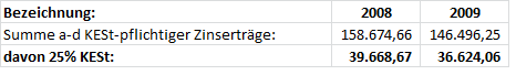 Da nach den Feststellungen der BP die gegenständlichen Fonds inländische festverzinsliche Wertpapiere beinhalten und die veranlagten Gelder in den Jahren 2008 und 2009 in der Forstverwaltung die Befreiungserklärungen hinsichtlich der Kapitalertragsteuer nicht widerrufen worden seien (Anmerkung: bisher keine Abfuhr der KESt), werden die Zinserträge daraus im Zuge der BP mit 25% wie folgt der Kapitalertragsteuer unterzogen (Rechtsmeinung des BMF):