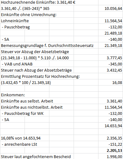 1. Folgt man der Begründung der Beschwerdevorentscheidung, hätte eine Hochrechnung von Einkünften - bei "ganzjährigem" Bezug von Einkünften aus einem Dienstverhältnis sowie von Einkünften aus selbständiger Arbeit - unterbleiben müssen, was eine Versteuerung des Bildungsteilzeitgelds ausgeschlossen hätte. Tatsächlich wurde der Begründung der Beschwerdevorentscheidung aber - nach Ausweis der Akten des Verwaltungsverfahrens - die folgende Berechnung zugrunde gelegt: