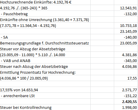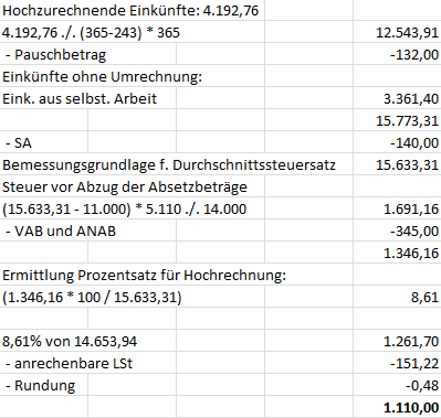 10. Die Umrechnungsvariante führt damit zu einer geringeren Steuer als die Kontrollrechnung. Sie ist folglich anzuwenden (Einkommen: 14.653,94 €; festgesetzte Einkommensteuer: 1.110,00 €, bisher 1.998,00 €).