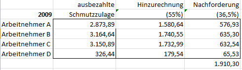 3. Nach den Feststellungen der Außenprüfung wurden die im Betrieb des Bf. ausbezahlten Schmutzzulagen nach "Kehrtagen" abgerechnet und mit 18% des Bruttostundenlohns steuerfrei belassen. Ausgehend von einer angemessenen Schmutzzulage von 8% wurde im Prüfungsbericht vom 23.8.2012 sodann die Feststellung getroffen, dass die ausbezahlten Schmutzzulagen mit gerundet 55% nachzuversteuern sind:
