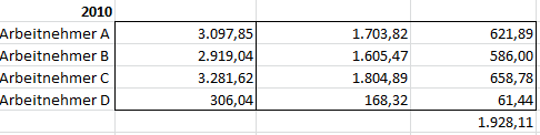 Auf der Grundlage einer kollektivvertraglichen Entlohnung von 1.700,24 € ab 1.5.2009 (vgl. Punkt II.6.i.) bedeutet dies beispielsweise, dass die Schmutzzulage 2010 des B von 1,77 € pro Arbeitsstunde (18% von 9,82 €) um 0,98 € (55%) auf 0,79 € gekürzt worden ist.