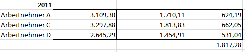 Gesellen (Arbeitnehmer mit Lehrabschlußprüfung ab 1.7.1994: wöchentlich 2.125 S, ab 1.1.2011 1.372,50 € monatlich.