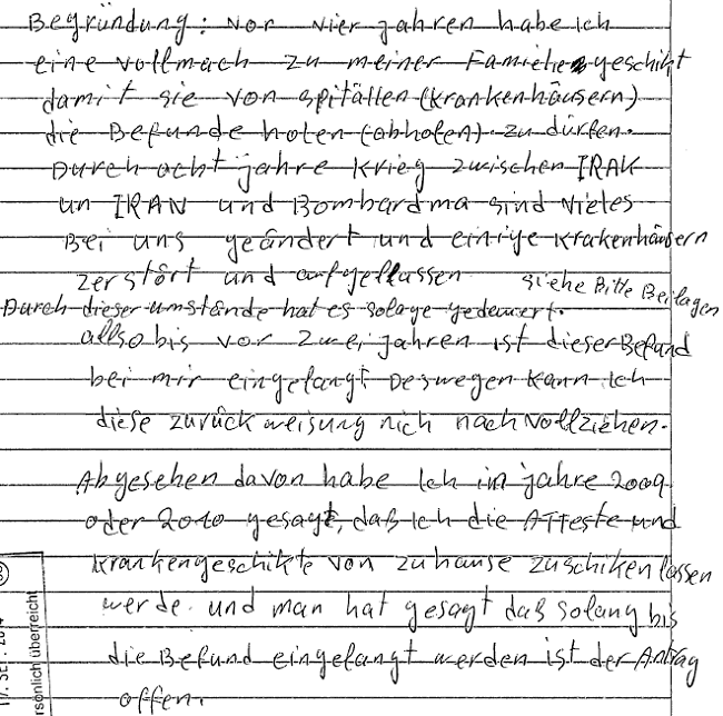 Schulbesuch bis zur Matura im Iran. Danach Flucht nach Österreich. Studien der Landwirtschaft und später Medizin nicht beendet. Seit der eigenen Familiengründung (3 Kinder 19,17 und 9) als Chauffeur gearbeitet. Führt an seit Jugend an depressiven Stimmungen gelitten zu haben (keine schriftlichen Unterlagen). Schriftliche Unterlagen belegen eine fachärztliche Betreuung zwischen 2002-2007 (Dr.I) Dg: Depressio mit psychotischen Beschwerden, psychosomatische Beschwerden, Zwanghafte Persönlichkeit. Er leide unter Konzentrationsstörungen, hätte Angst vor zu vielen Menschen. Im Gespräch wenig affizierbar. Seit einem Jahr in befristeter I-Pension.