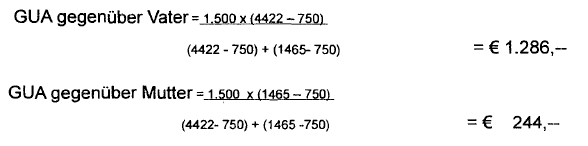 Bei einer Bemessungsgrundlage der Mutter von monatlich € 1.465,34 und des Vaters von monatlich € 4.422,— würde sich ein Anspruch von rund je € 885,- gegen dem Vater und je € 295,- gegenüber der Mutter errechnen.