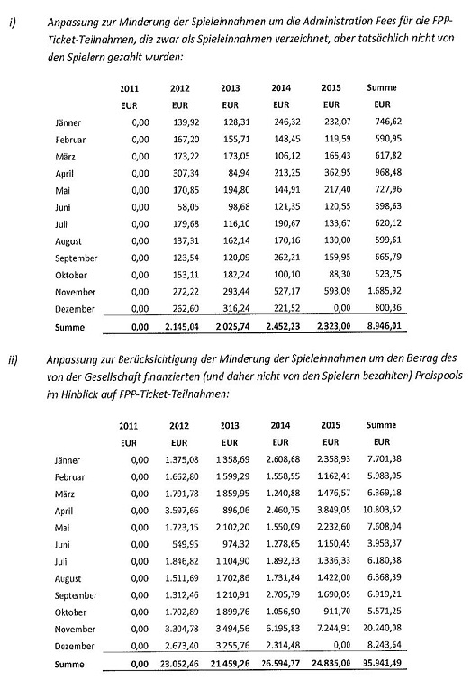 Die Bemessungsgrundlagen würden sich als Summe von Rake, Teilnahmegebühren und Einsätzen (abzüglich ausbezahlter Gewinne), welche von Spielern geleistet worden seien, die eine österreichische Wohnadresse hätten, ergeben.