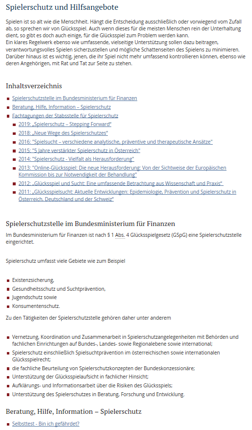 Dem Abgehen von fiskalischen Ziesetzungen standen aber erhöhte Anforderungen an die Konzessionäre gegenüber, wie hohes Grundkapital, feste Gebühren, Ausgaben im Zusammenhang mit Spielerschutz wie der Finanzierungsbeitrag gemäß § 1 Abs. 4 GSpG, mit dem die Stabsstelle für Spielerschutz im BMF finanziell ausgestattet wird und mit dem Personalkosten, Kosten für Teilnahme an Tagungen, Druck und Versand von Glücksspielsuchtbroschüren der Stabsstelle an alle österreichweiten Spielschutzeinrichtungen, und an Behörden, sowie Kosten für Werkverträge über Repräsentativumfragen und z.B. Onlinestudien finanziert werden. (13395/AB 24.GP, 11, abrufbar über die Homepage des Parlamentes). Die Spielerschutzstelle ist in Begutachtungsverfahren von Gesetzes- und Verordnungsentwürfen eingebunden und unterstützt auch die Glücksspielaufsicht in fachlicher Hinsicht und führt mit den Konzessionären Gespräche zum fachlichen Austausch. Diese Gespräche werden Konzessionären bescheidmäßig auferlegt. (BMF, Glücksspielbericht 2014-2016, 32-33). Darüber hinaus ist die Spielbankkonzessionärin an Maßnahmen des Responsible Gaming gesetzlich über § 25 GSpG und bescheidmäßig gebunden. Zusätzliche Kosten entstehen ihr auch durch die Beratungsgespräche durch besonders geschulte Mitarbeiter, sowie durch Informations- und Beratungsgespräche und insbesondere durch begleitend intensivere Personalschulungen. (BMF, Glücksspielbericht 2014-2016, 8; vgl. auch Landesverwaltungsgericht Salzburg 25.03.2019, 405-10/438/1/22-2019).