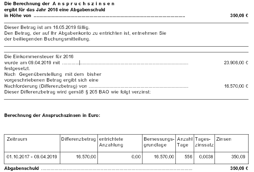 Die Anspruchszinsen wurden ausgehend von einem Differenzbetrag von 16.570,00 € gegenüber der bisherigen Vorschreibung mit 350,09 € festgesetzt: