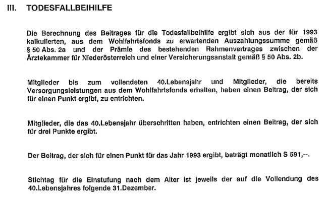 Gemäß § 12 Abs. 6 der Beitragsordnung der Ärztekammer für Niederösterreich ist vom Beitrag zur Bestattungsbeihilfe und Hinterbliebenenunterstützung ein Teil von zwei Dritteln gemäß § 4 Abs. 4 bzw. § 16 EStG der Ablebensleistung gewidmet und im Rahmen der Betriebsausgaben bzw. Werbungskosten steuerfrei unbegrenzt absetzbar. Ein Drittel des Beitrages ist der Erlebensleistung gewidmet und gemäß § 18 EStG im Rahmen der Sonderausgaben beim zuständigen Finanzamt geltend zu machen.