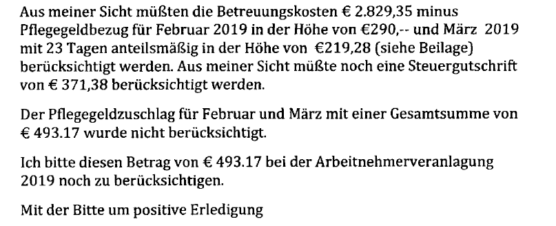 "Von den ursprünglich geltend gemachten Kosten in Höhe von 4.576,67 Euro wurden die Betreuungskosten (2.829,35 €) abgezogen, diese sind mit dem Pflegegeld abgegolten. Somit kommen 2.372,68 Euro als zusätzliche Kosten zum Ansatz."