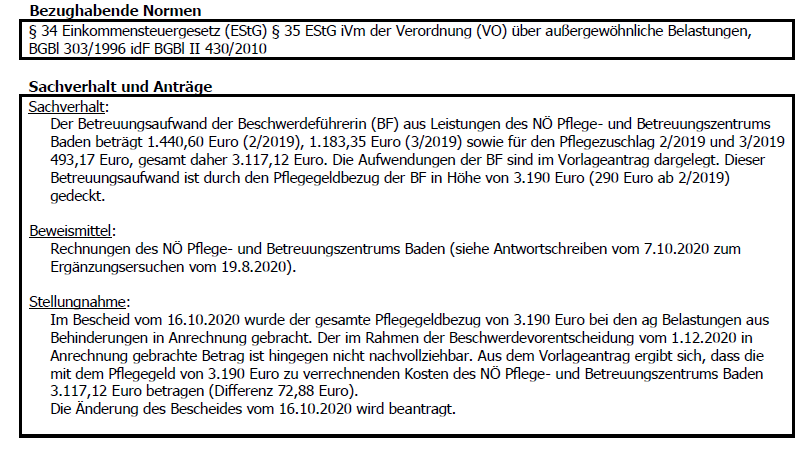 Die Beschwerdeführerin legte fristgerecht eine Aufstellung der außergewöhnlichen Belastungen sowie die entsprechenden Belege vor. Neben Rechnungen für Ärzte, Ambulatorien, Apotheken und Heilbehelfe legte die Beschwerdeführerin folgende Abrechnung einer Pflege- und Betreuungseinrichtung vor: