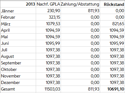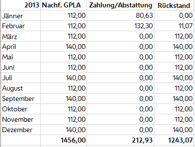 2013 | Nachforderung | Zahlung/Abstattung | Rückstand |