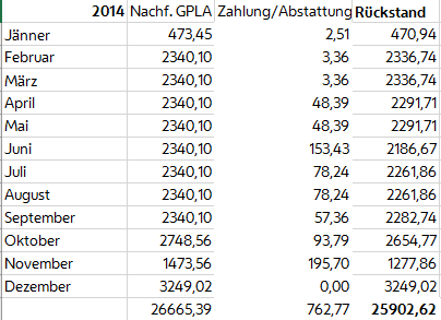 2014 | Nachforderung | Zahlung/Abstattung | Rückstand |