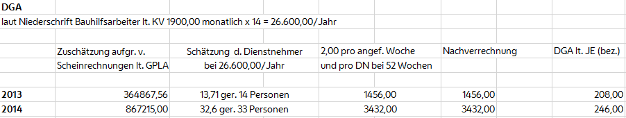 | Zuschätzung Rechnungen | Schätzung der Dienstnehmerbei € 26.600/Jahr | € 2,00 pro angefangene Woche und pro DN bei52 Wochen | Nachverrechnung |
