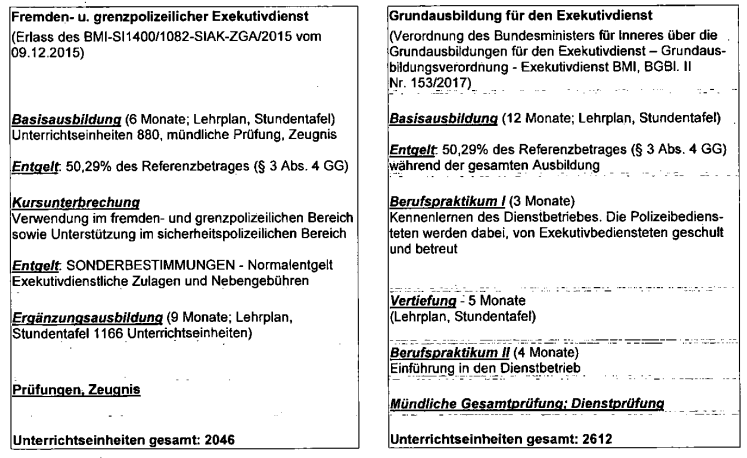 Zur Verdeutlichung werden die Unterschiede der Ausbildungslaufbahn der "Grenzpolizisten" jenen der "Polizisten" (Exekutivdienst) überblicksmäßig gegenübergestellt: