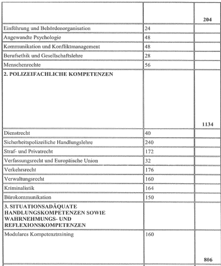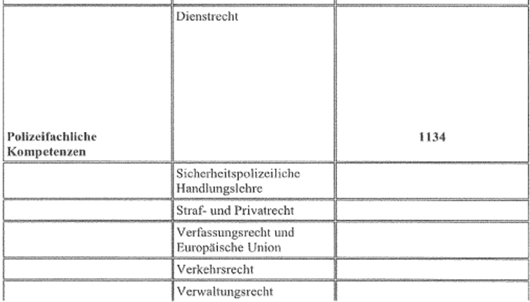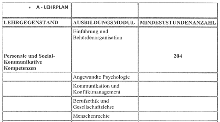 Der im Verfahren ausschließlich vorliegenden Stundentafel (einen Stundenplan, wann welche Einheiten absolviert wurden, hat die DG nicht vorgelegt), ist zu entnehmen, dass im Unterricht hauptsächlich Wissen und Handlungskompetenz vermittelt wurde. Praktische Einsätze erfolgten im Rahmen der Basisausbildung nicht. Als Schwerpunkte der polizeilichen Grundausbildung wurden Handlungssicherheit und Bürgernähe auf Basis menschenrechtskonformen Verhaltens definiert (Siehe Ausbildungslehrplan Seite 9).