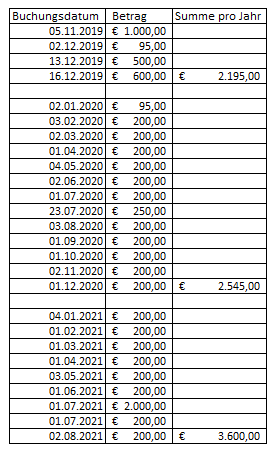 5. Die Beschwerdeführerin hat ihren Sohn seit November 2019 mit insgesamt EUR 8.340,00 an Unterhaltszahlungen unterstützt. Hiervon wurden im Jahr 2019 für die Monate November bis Dezember 2019 EUR 2.195,00, für die Monate Jänner 2020 bis Dezember 2020 EUR 2.545,00 und in der Zeit vom 04.01.2021 bis 02.08.2021 insgesamt EUR 3.600,00 bezahlt.