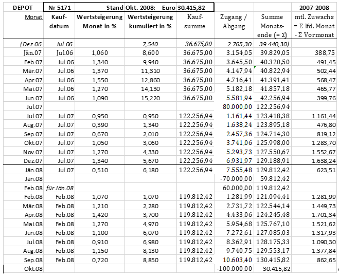 Im Oktober 2008 verringerte sich aufgrund der Auszahlung im Zuge der Ausstellung des Treuhandauftrages der "Depotwert" auf 30.415,82 Euro.