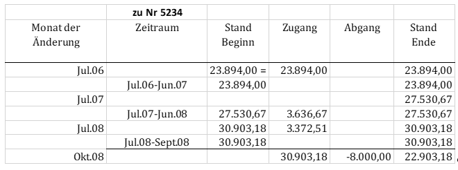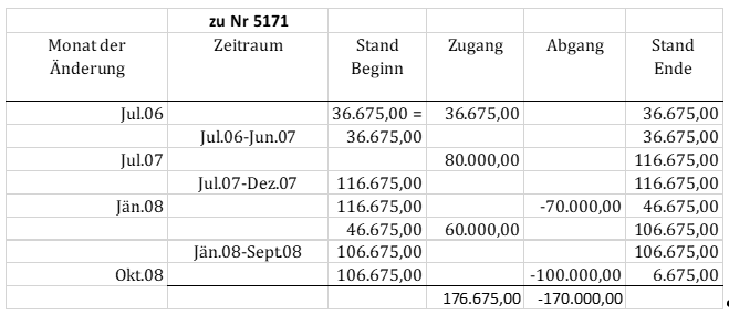 Für Juli 2007 wurden zwei Mitteilungen vorgelegt: Auf der ersten Mitteilung ist in Handschrift der Vermerk "+50.000 Euro +30.000 Euro; 122.256,94 Euro" angefügt. In der obigen Tabelle ist dieser Vorgang in der ersten "Jul.07"-Zeile und den Einträgen 80.000,00 in den Spalten "Zugang/Abgang" und 122.256,94 in "Summe Monatsende" ersichtlich. Der Betrag von 122.256,94 Euro stellt gleichzeitig - wie aus der zweiten Mitteilung für den Juli 2017 und in der Tabelle in der zweiten "Jul.07"-Zeile ersichtlich - die neue Bemessungsgrundlage (= "Kaufsumme" in den Mitteilungen) am Beginn des Monats Juli 2007 dar.
