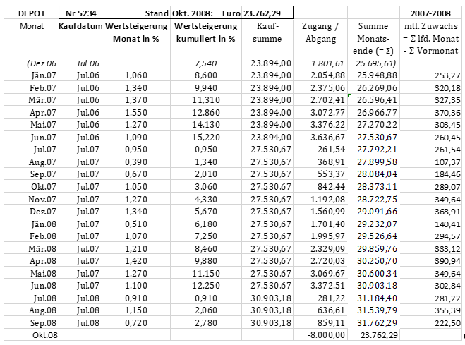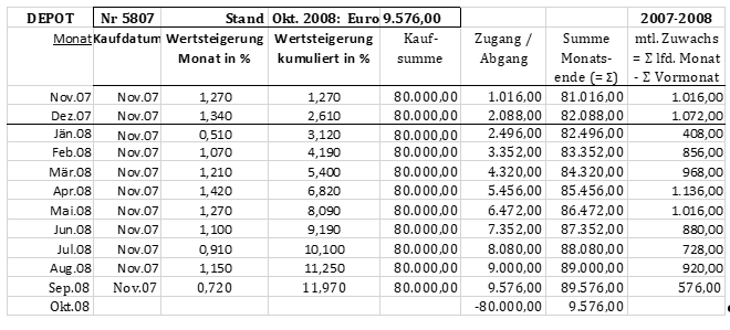 Der "Depotwert" veränderte sich im Zeitraum November 2007 bis September 2008 von 80.000,00 Euro auf 89.576,00 Euro und betrug im Oktober 2008 nach der Auszahlung 9.576,00 Euro.