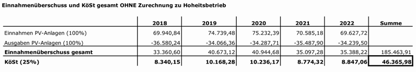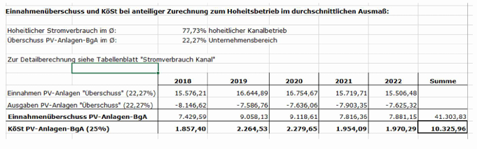 Unter Berücksichtigung der uE auf den hoheitlichen Kanalbetrieb entfallenden Einnahmenüberschüsse von durchschnittlich 77,73 % (EUR 144.160,08), verbleibt für die Jahre 2018 - 2022 ein dem PV-Anlagen-BgA zuzurechnender, körperschaftsteuerpflichtiger Einnahmenüberschuss von insgesamt EUR 41.303,83 (22,27 %). Für den Zeitraum 2018 - 2022 ergibt sich für den PV-Anlagen-BgA damit eine Körperschaftsteuer von EUR 10.325,96.