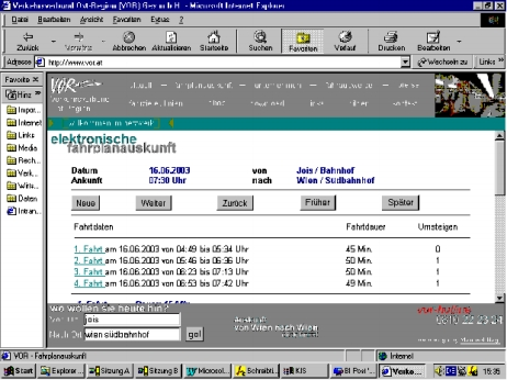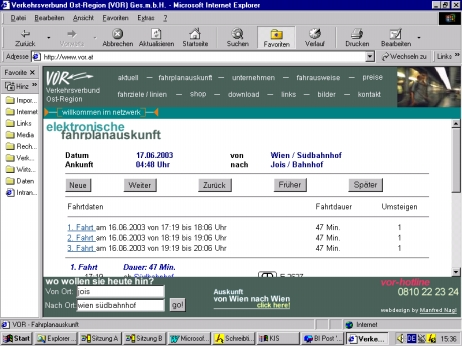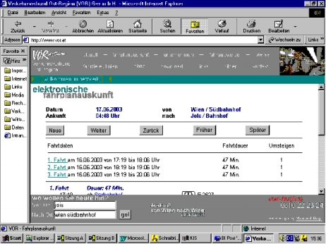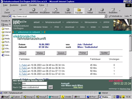 Der Unabhängige Finanzsenat folgt hierbei dem Vorbringen der Parteien des zweitinstanzlichen Verfahrenes. Die Verbindungen zwischen Jois und Wien wurden mittels der elektronischen Fahrplanauskunft http://www.vor.at ermittelt. Die Auskunft bezieht sich zwar auf einen Wochentag im Sommersemester 2003; dass im Jahr 2001 andere Verhältnisse geherrscht hätten, wurde von den Parteien des zweitinstanzlichen Verfahrens nicht behauptet. Der Bw. spricht selbst von einer Fahrzeit mit dem Zug zwischen Jois und Wien Südbahnhof von 50 Minuten.