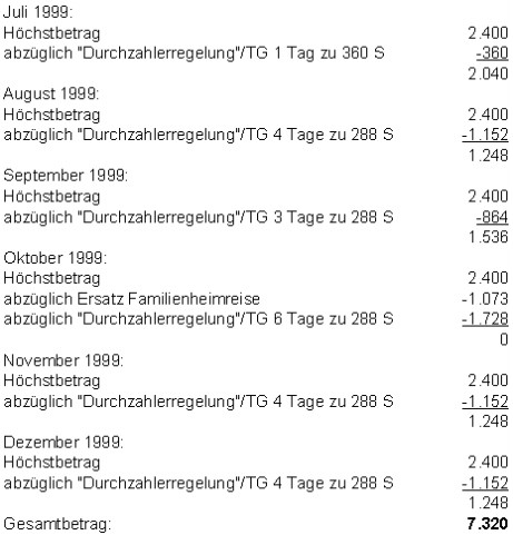Im Vorlageantrag vom 27. Juli 2003 wendete der Bw. gegen diese Berechnung ein, der Zuteilungsort D. sei 480 km vom Familienwohnort C. entfernt. Der Bw. habe daher für die einfache Strecke eine Fahrzeit von ca. sechs bis sieben Stunden benötigt. Dabei habe er die Heimreise nach C. nach Dienstende nie vor 17.00 Uhr antreten können. An den Rückreisetagen habe er bereits um die Mittagszeit (zwischen 13.00 Uhr und 15.00 Uhr) von C. wegfahren müssen, um den Zuteilungsort zu einer angemessenen Zeit erreichen zu können; die Rückreise mit öffentlichen Verkehrsmitteln habe spätestens um 14.30 Uhr beginnen müssen. Daraus errechneten sich (ohne die jeweiligen Reisetage) für Juli 1999 ein Tag und für den Zeitraum August bis Dezember 1999 insgesamt 21 (wiederum kalendermäßig bezeichnete) Tage der Abwesenheit vom Zuteilungsort. Wie in der Berufungsvorentscheidung ausgeführt, sei die jährliche Höchstgrenze der steuerlich absetzbaren Kosten für Familienheimfahrten auf Monatsbeträge umzurechnen. Für die Familienheimfahrten von D. nach C. werde daher nachstehender Betrag an Werbungskosten beantragt (Beträge in Schilling):