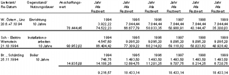 Die Abschreibungen (Afa normal) ergeben sich aus einer weiteren Beilage mit der Bezeichnung "ANLAGENVERZEICHNIS FÜR M.S. " und folgenden Darstellungen: