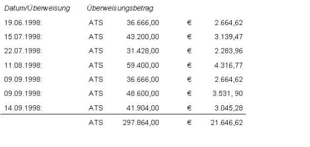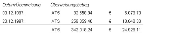 Nach den Eintragungen im Sparbuch sind im Zeitraum 9. Dezember 1997 bis 14. September 1998 laufend Einzahlungen aufgrund von Rechnungen der KEG getätigt worden; diese Einzahlungen haben insgesamt ATS 1.412.057,90 betragen.