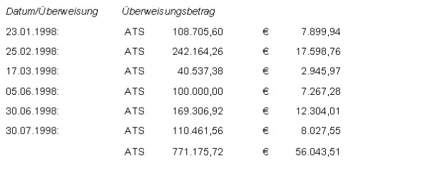 1998 sind auf das anonyme Sparbuch ATS 771.175,52 (= € 56.043,51) überwiesen worden; die vom Finanzamt durchgeführte Umsatzzurechnung € 77.674,92) ist daher nicht zu Recht erfolgt.