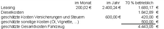 + anteilige (auf die betriebliche Nutzung entfallende) Kosten für PKW-Leasing unter Zugrundelegung der Angaben im vorgelegten Leasingvertrag in Höhe von 1.680,17 € (im vorliegenden Fall bedarf es keiner Bildung eines Aktivpostens gemäß § 8 Abs. 6 Z 2 EStG)