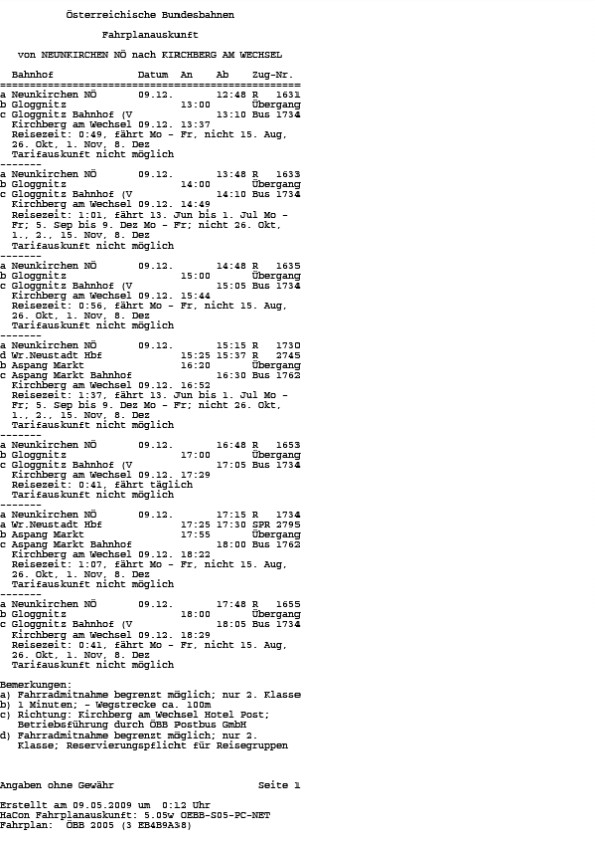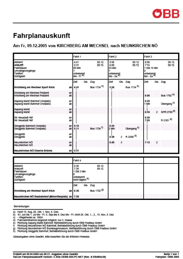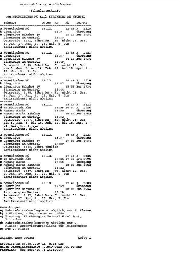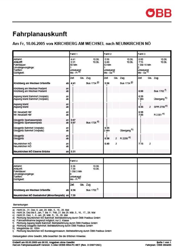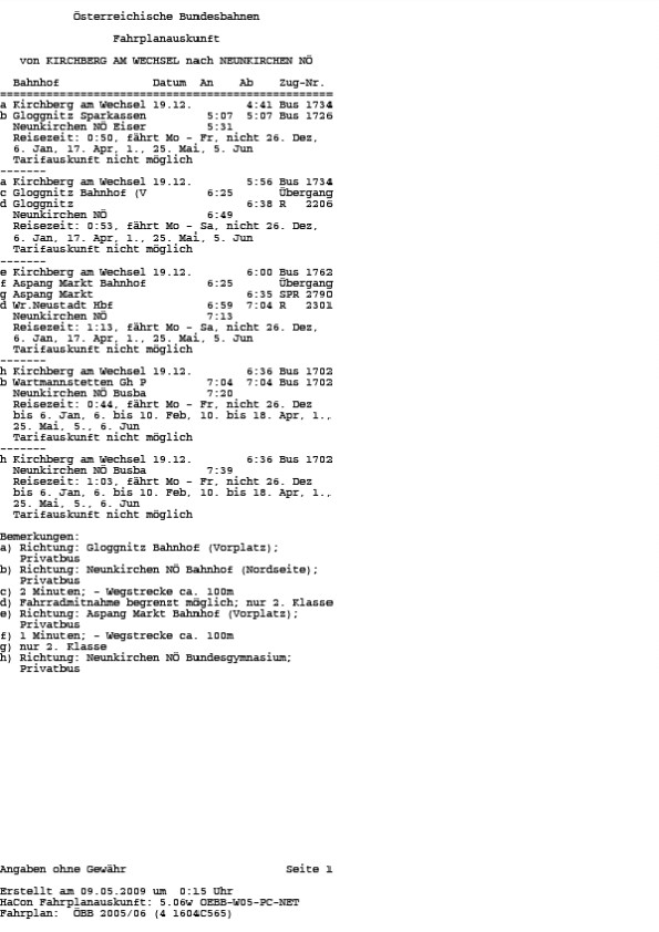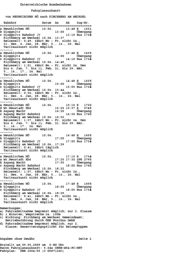 Unstrittig ist, dass zwischen Kirchberg am Wechsel und Neunkirchen bei Kombination von Bus und Bahn sämtliche verkehrenden öffentlichen Verkehrsmittel im Berufungszeitraum eine Fahrzeit von nicht mehr als einer Stunde aufweisen. Diese Verkehrsmittel verkehren auch zu Zeiten, zu denen eine Verwendung durch Schüler zumutbar ist. Darüber hinaus bestehen auch andere öffentliche Verbindungen mit Fahrzeiten etwas über einer Stunde. Im einzelnen sind dies unter anderem folgende Verkehrsmittel (Winterfahrplan 2004/2005, Sommerfahrplan 2005, Winterfahrplan 2005/2006):