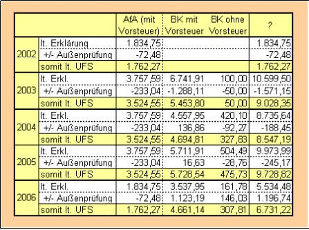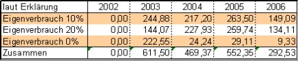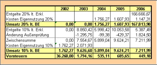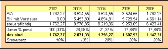 Die auf die Privatnutzung entfallenden Aufwendungen wurden bisher mit folgenden Werten ausgeschieden und umsatzsteuerlich als Eigenverbrauch erklärt. Der Steuersatz des Eigenverbrauchs richtete sich nach den Vorleistungen. Die anteiligen mit 10 % belasteten Betriebskosten führten danach zu einem mit 10 % besteuerten Eigenverbrauch, die anteiligen Versicherungsaufwendungen und Vereinsbeiträge wurden mit 0 % erfasst und die anteiligen Betriebskosten 20 % (ab 2004 zuzüglich der gesamten anteiligen AfA) wurden mit 20 % der Eigenverbrauchsbesteuerung unterzogen. Daraus ergaben sich die folgenden Eigenverbrauchs-Bemessungsgrundlagen: