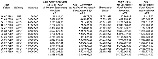 "Aufgrund der Ermittlungen der Bp ergeben sich bezüglich der obigen Aufstellung folgende Änderungen: Die am 11.8.1999 erworbenen Nullkuponanleihen im Nominale von 14.000.000 USD wurden lt. unterfertigter Übernahmebestätigung des Kunden nicht am 30.8.99, sondern am 7.9.99 übernommen, wodurch sich eine entsprechende Änderung der KESt-Abfuhr ergibt. Ebenso wurden die am 5.10.99 erworbenen Anteile nicht am 20.10.99, sondern am 28.10.99 übernommen." Die fiktive KESt bei Übernahme durch den Kunden würde sohin 55.706.368,23 S betragen.